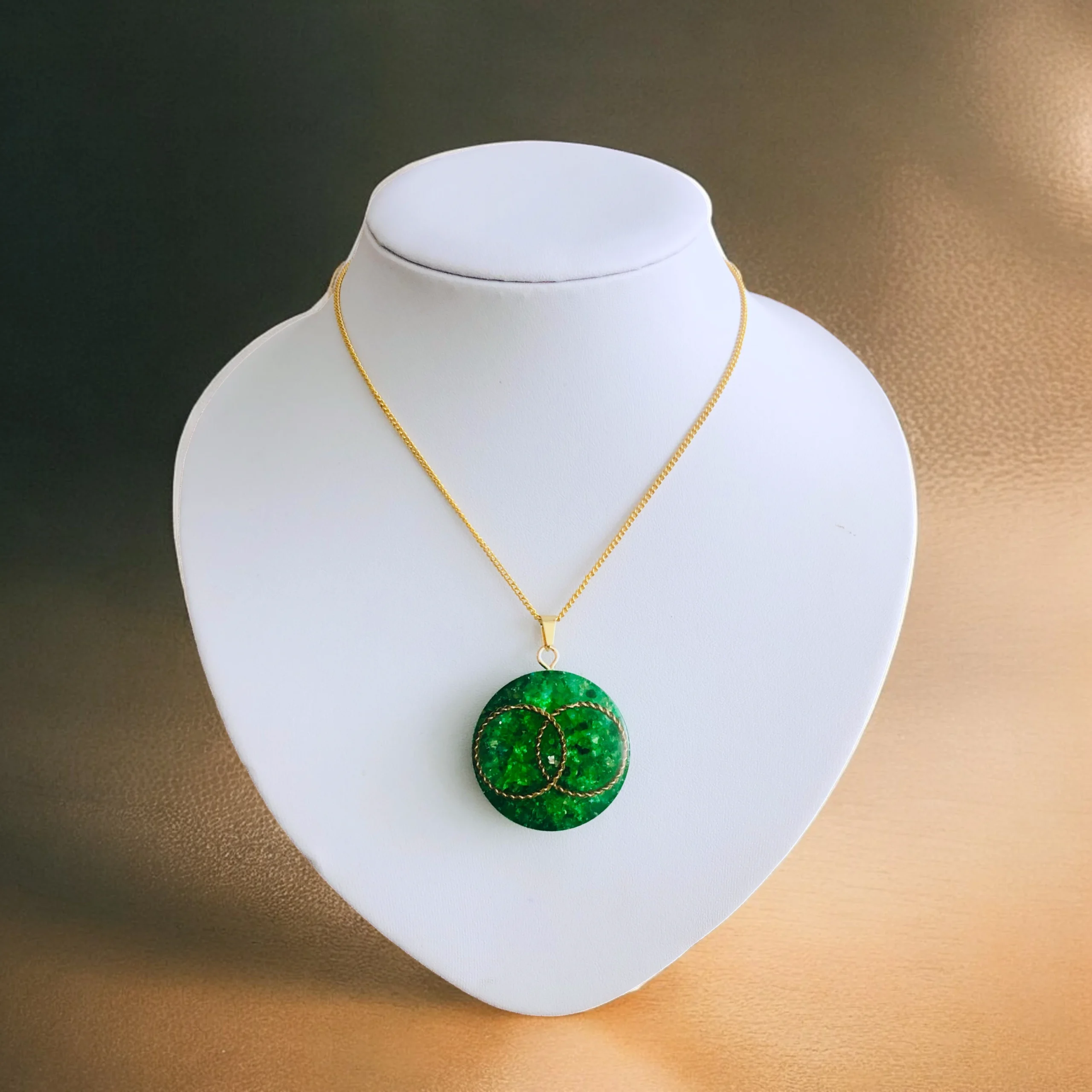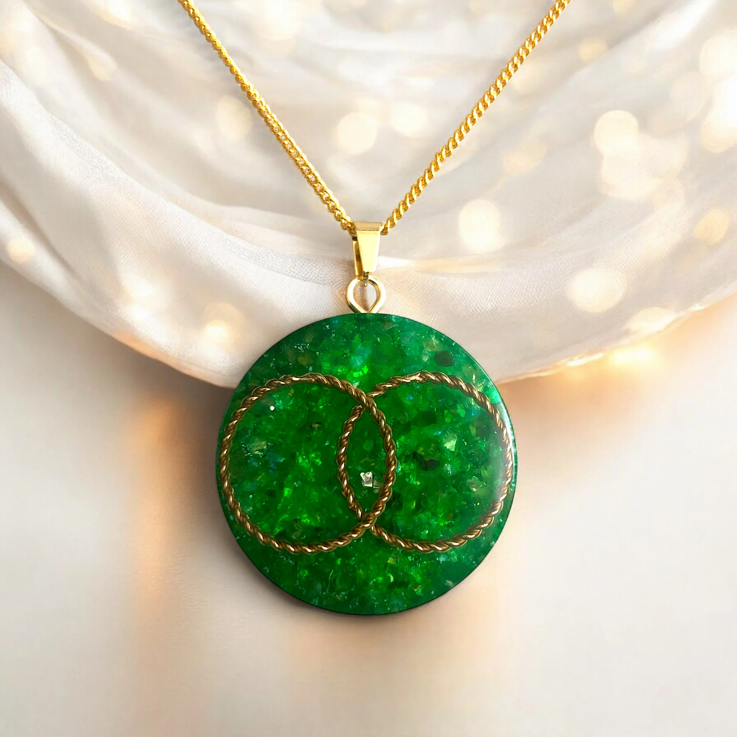 Aura Healer Vesica Piscis Orgonite hanger met Peridoot en Tensor ringen