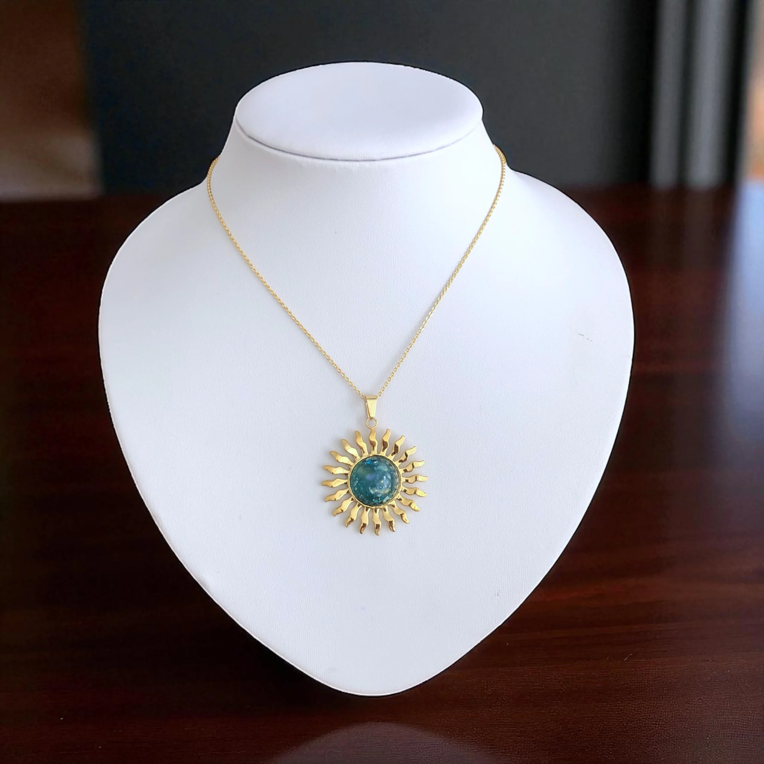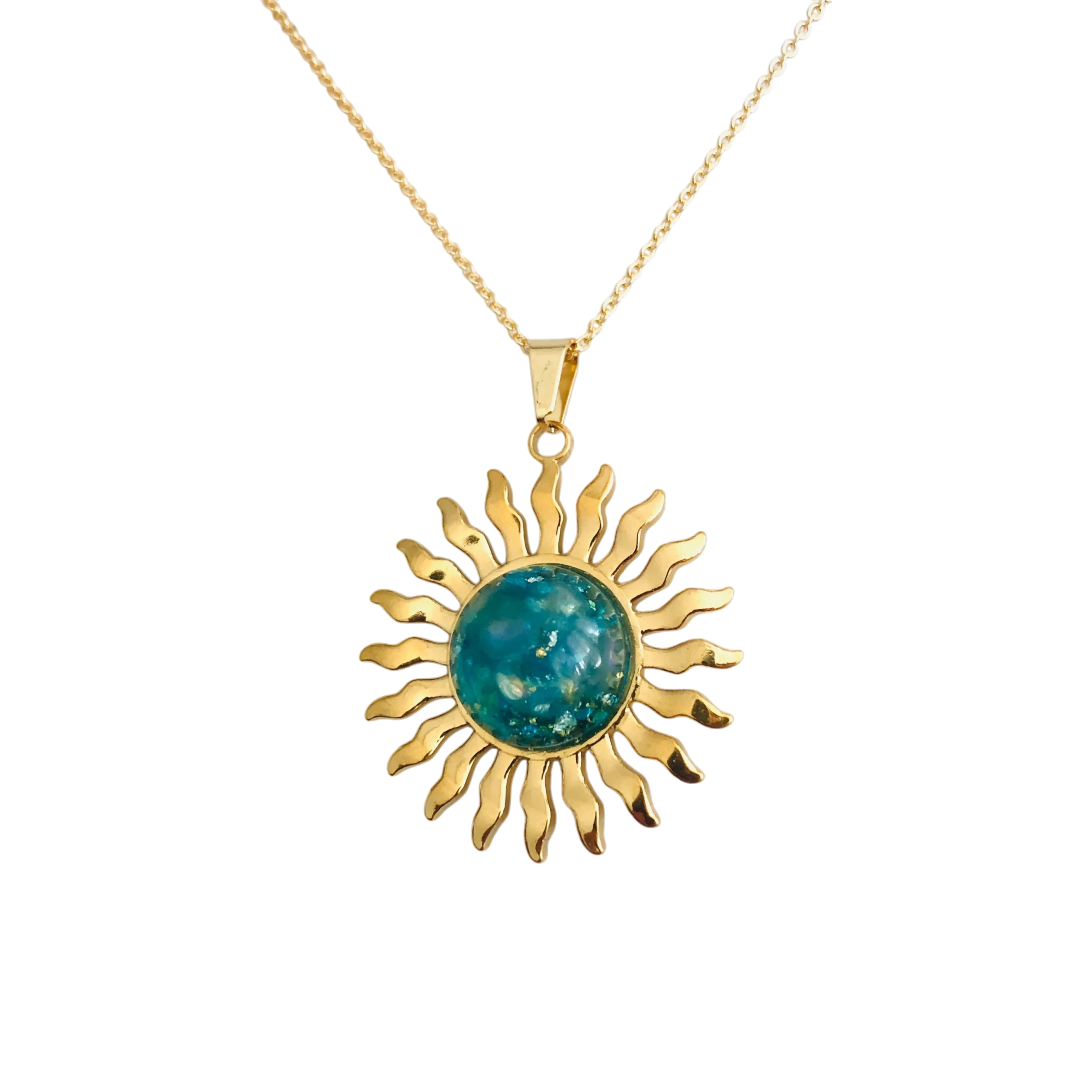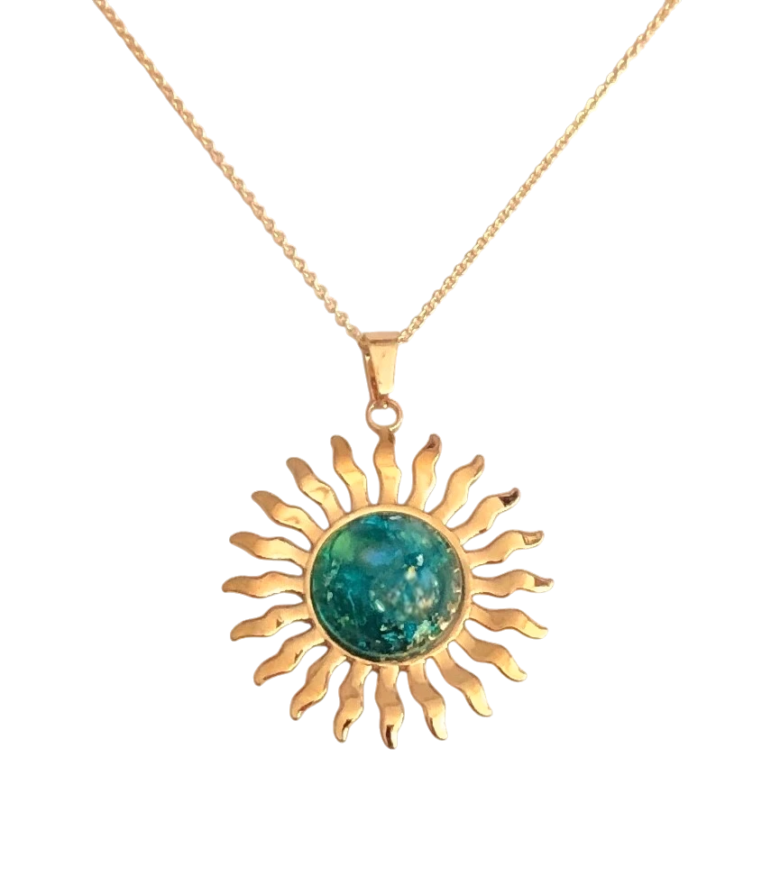 Elke orgonite Aquamarijn hanger bevat bovengenoemde edelmetalen en edelstalen en heeft haar eigen unieke uitstraling. De doorsnee van de verguld messing hanger is ca 35 mm. Het zon symbool is gemaakt van 20 karaat gold plated messing. Bestel hier een bijpassende ketting.